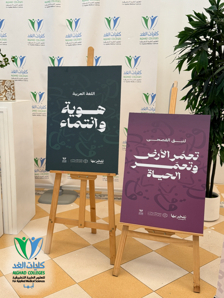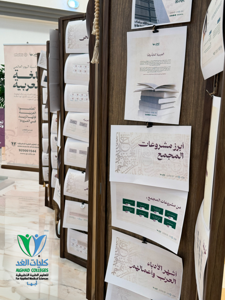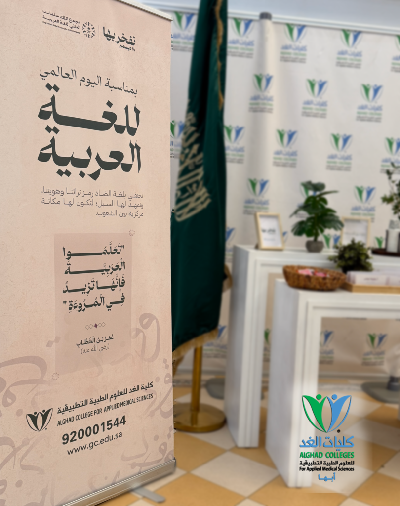 فعلت كلية الغد للعلوم الطبية التطبيقية احتفاءها باليوم العالمي للغة العربية، وذلك يوم الخميس الموافق 18 ديسمبر 2025م، تأكيدًا على أهمية اللغة العربية ودورها في تعزيز الهوية الثقافية والوطنية. وتضمن الاحتفاء تنظيم معرض ثقافي بعنوان «نفخر بها»، اشتمل على عرض أبرز الاقتباسات والأقوال حول اللغة العربية، والتعريف بأشهر الشخصيات الأدبية وإسهاماتهم، إضافة إلى إبراز خصائص اللغة العربية وأشهر الأخطاء الشائعة فيها، ومفهوم تعريب الكلمات وأهميته، إلى جانب تقديم معلومات عامة ومتنوعة تسهم في إثراء المعرفة اللغوية وتعزيز الوعي بأهمية اللغة العربية. كما شمل المعرض عرض نبذة تعريفية عن مجمع الملك سلمان العالمي للغة العربية ودوره في خدمة اللغة العربية، إلى جانب تحفيز منسوبي الكلية على تفعيل هاشتاق #نفخر_بها، وتوزيع بطاقات تعريفية بأسماء الموظفين تحمل شعار الحملة، بالإضافة إلى توزيعات رمزية للحضور. وقد أسهمت الفعالية في رفع مستوى الوعي بأهمية اللغة العربية وتعزيز الاعتزاز بها بين منسوبي الكلية.